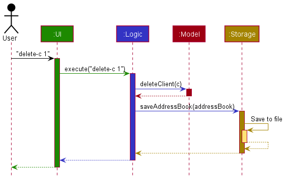 Commandobject (more precisely, an object of one of its subclasses e.g.,DeleteClientCommand) which is executed by theLogicManager. - The command can communicate with the