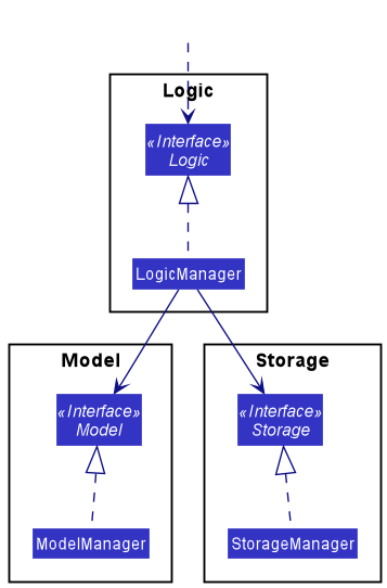 For example, the Logic component defines its API in the Logic.java interface and implements its functionality using the LogicManager.java class which follows the Logic interface. Other components interact with a given component through its interface rather than the concrete class (reason: to prevent outside component’s being coupled to the implementation of a component), as illustrated in the (partial) class diagram below.
